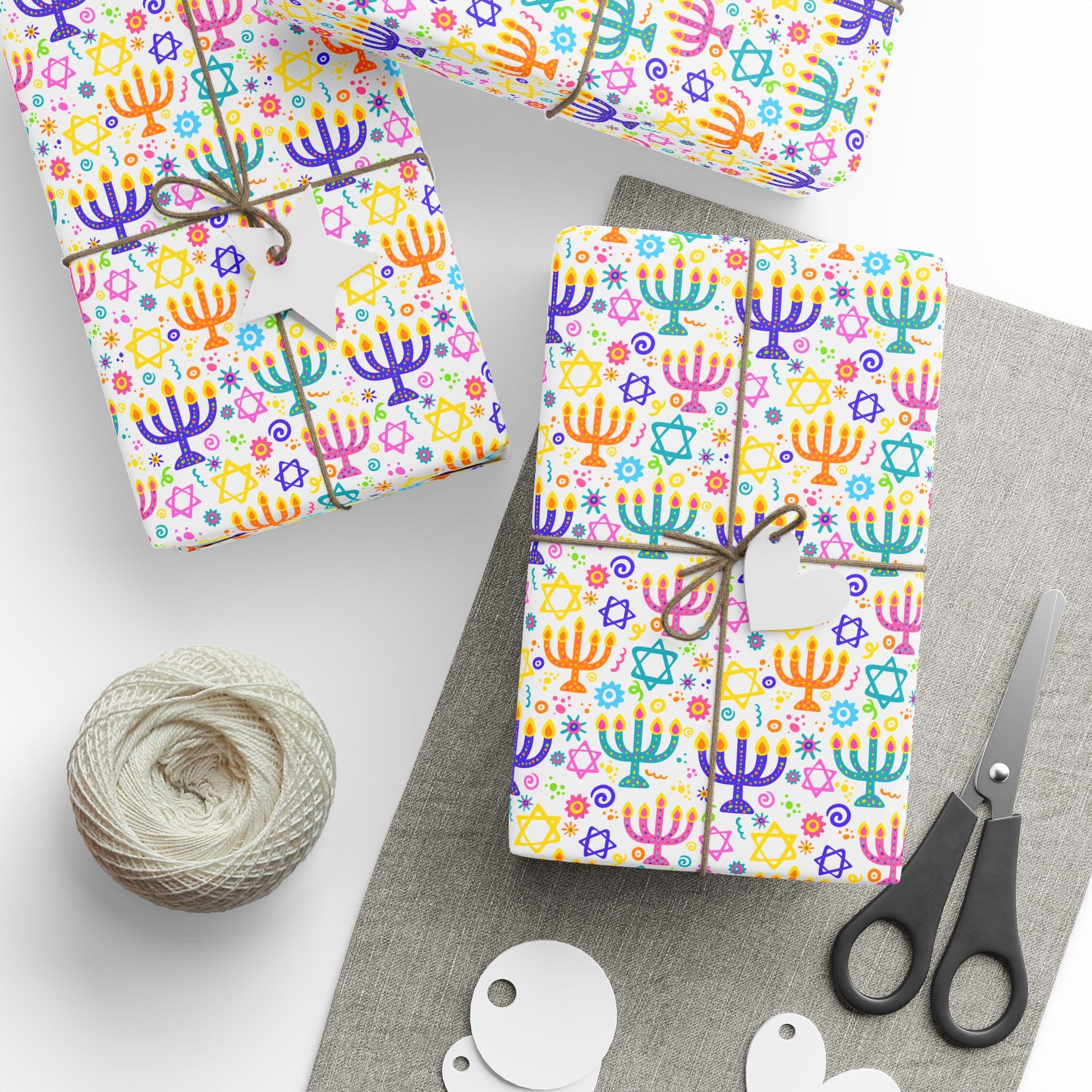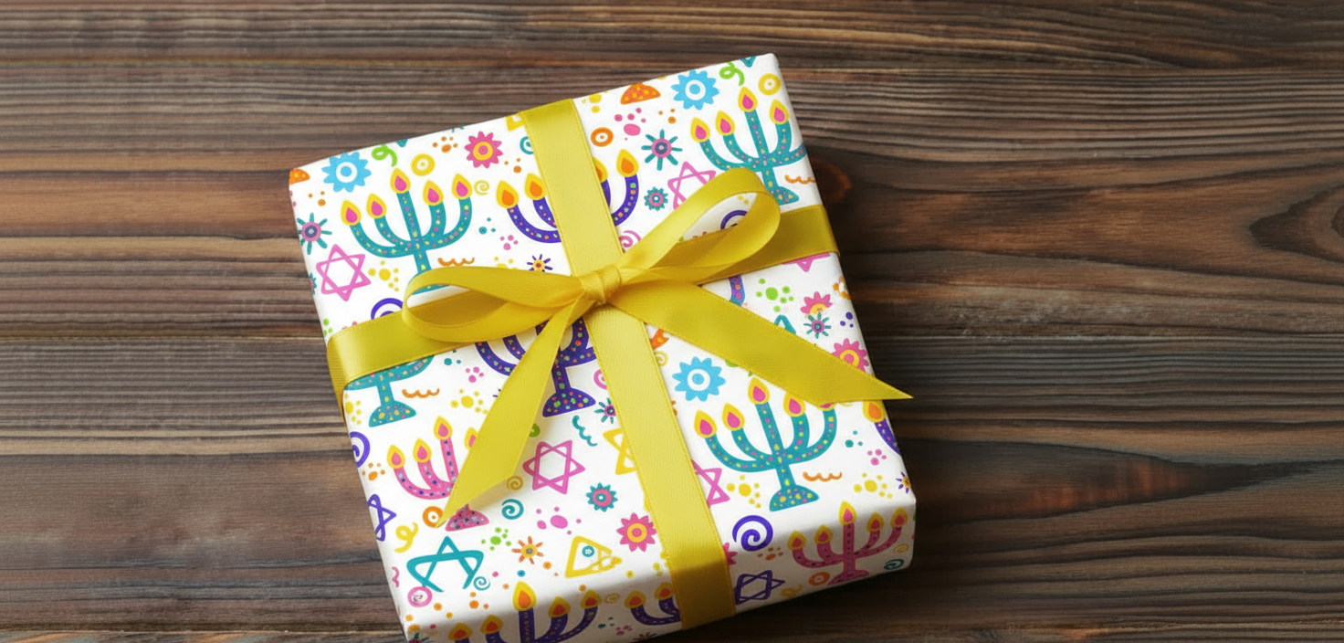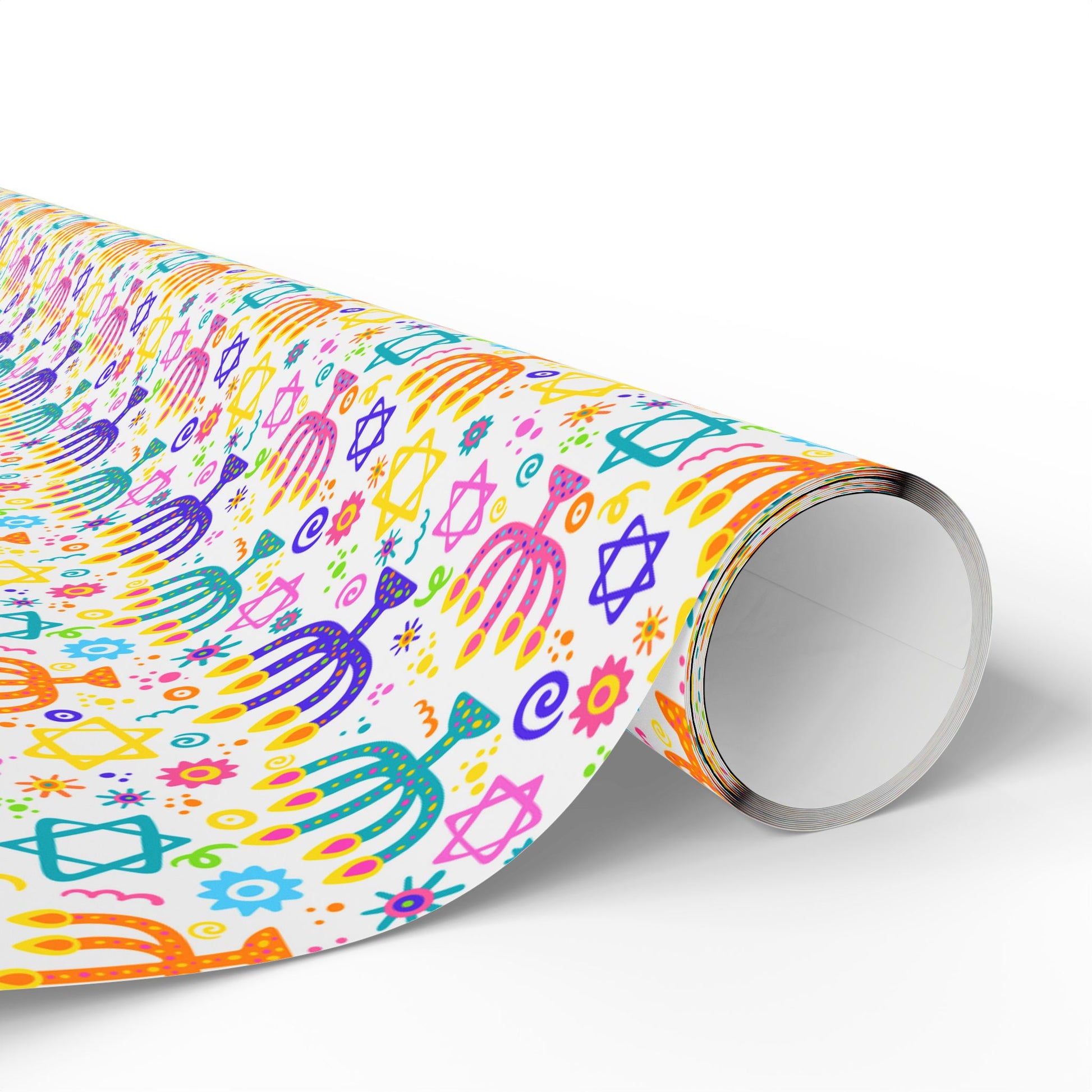 Neon menorahs and dreidels light up white - holiday cheer turned electric.